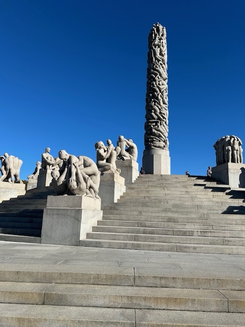 Another of those ”must do” places is the Vigeland Sculpture Park. According to many guidebooks and Rick Steves videos this park is grand, beautiful and thought-provoking. Of course, I didn’t believe it until I actually saw the park. We took the trolley and entered through the park area of lush gardens and sculptures. But, when you enter the sculpture park the sculptures in bronze, granite and cast iron are almost overwhelming.