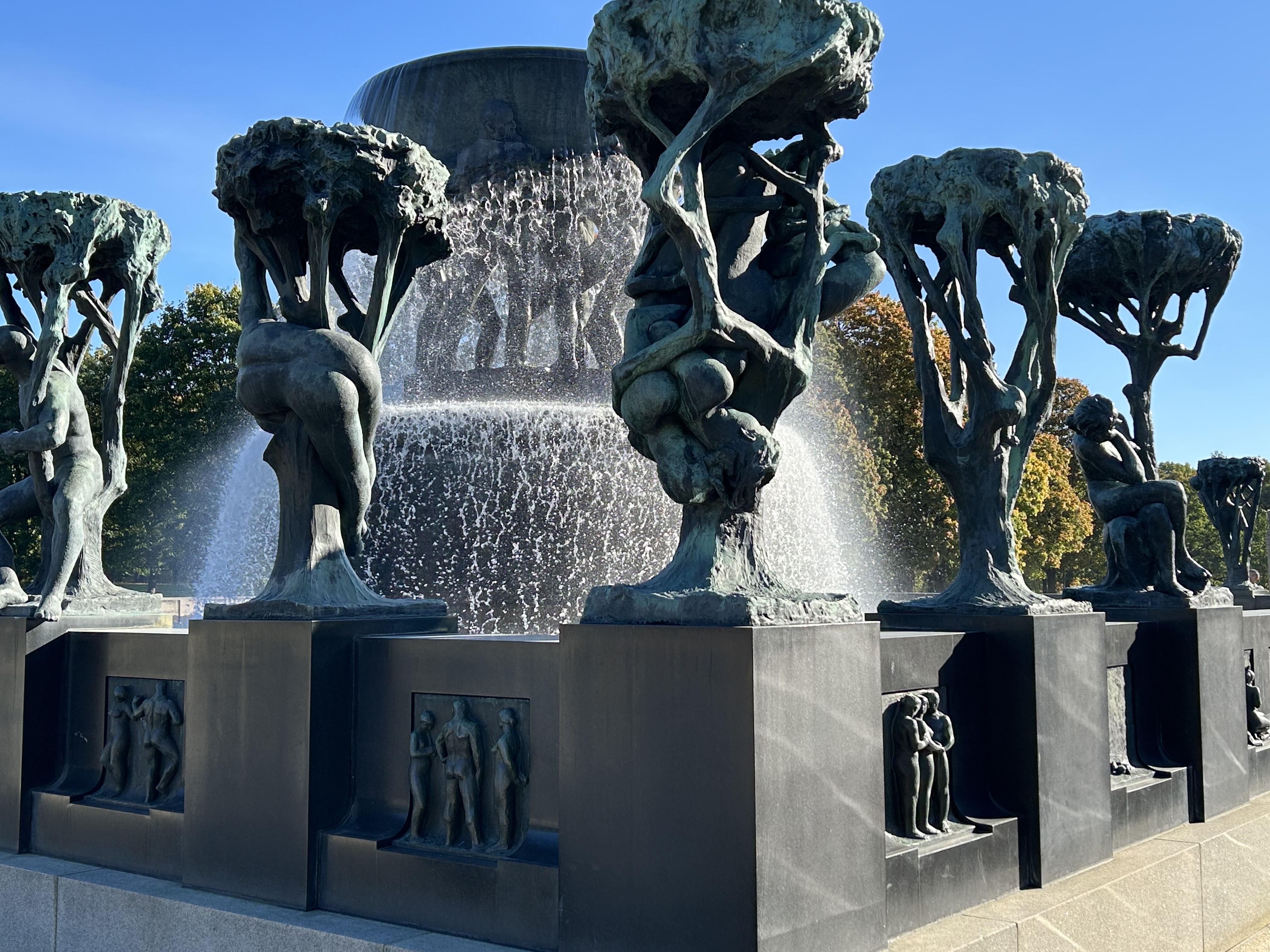 Another of those ”must do” places is the Vigeland Sculpture Park. According to many guidebooks and Rick Steves videos this park is grand, beautiful and thought-provoking. Of course, I didn’t believe it until I actually saw the park. We took the trolley and entered through the park area of lush gardens and sculptures. But, when you enter the sculpture park the sculptures in bronze, granite and cast iron are almost overwhelming.